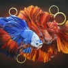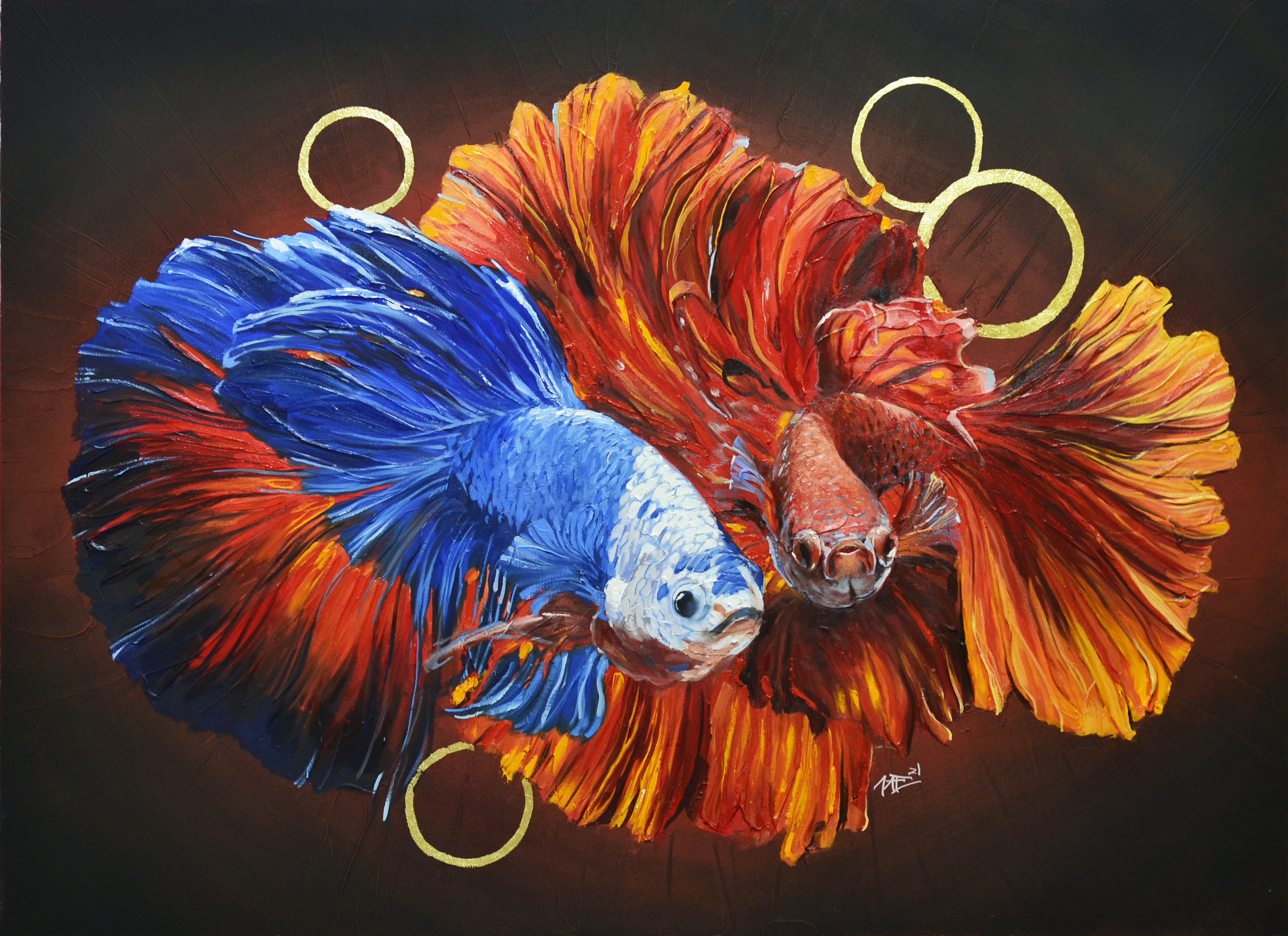 The composition is built on contrast and harmony: two large betta fish seem to float against the background of dark water. One is electric blue with turquoise reflections, the other is fiery red, almost orange. Their luxurious, almost weightless fins form a complex pattern reminiscent of precious silk or flame. Golden circles float in the water, giving the picture mysticism and rhythm. The very opposition of the fish seems like a dance - the interaction of opposites, a symbol of duality, the energy of life, beauty and unpredictability of nature.