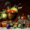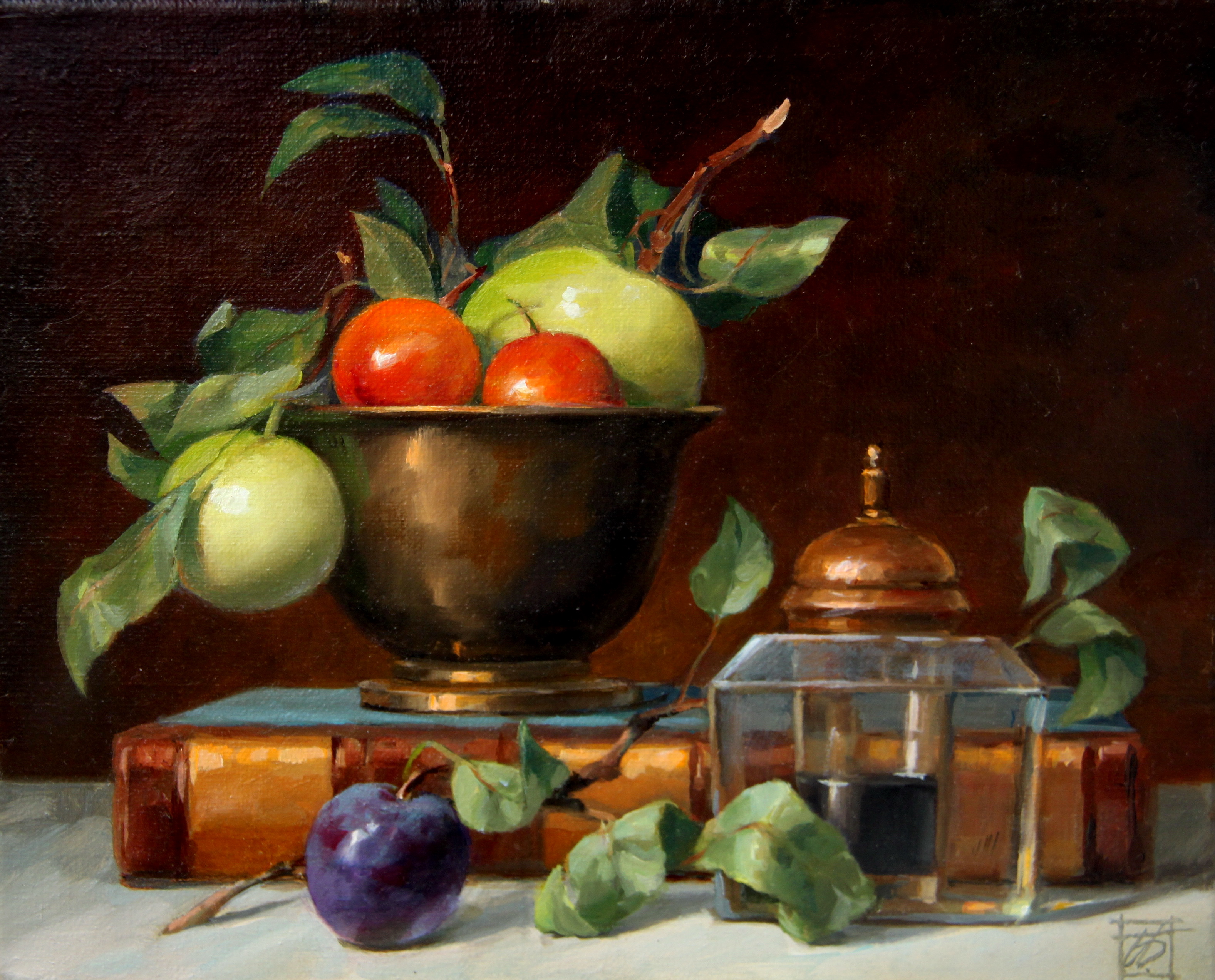 An antique book and an inkwell transport the viewer a century and a half back in time. The combination of attributes of literary creativity and fresh leaves and fruits symbolizes the immortality of literary classics. The still life is painted from life using a multi-layered painting technique that creates the illusion of volume and tangibility of the objects.