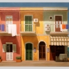 The work stylistically balances on the edge between realism and suprematism. Bright colorful geometric shapes on a blue background are perceived as a positive, relaxing abstraction. At the same time, the details, color accents, figurative characteristics, as well as the sense of tangible materiality of the multilayered oil painting emphasize the reality of the image, evoking memories of a summer vacation by the sea.
