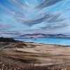 The viewer is presented with a wide panoramic view of a lake surrounded by low, golden-brown hills. A road winds along the dried grass and bushes, leading to a distant shore. Dark forests are visible on the left, and blue mountain ranges stretch along the entire horizon. The lake, illuminated by a soft light, stands out brightly with a rich azure. The clouds, stretched across the sky in bizarre stripes and brushstrokes, give the landscape a special expressiveness. The painting conveys the grandeur of the Siberian or Baikal landscape - nature is large, spacious and free.