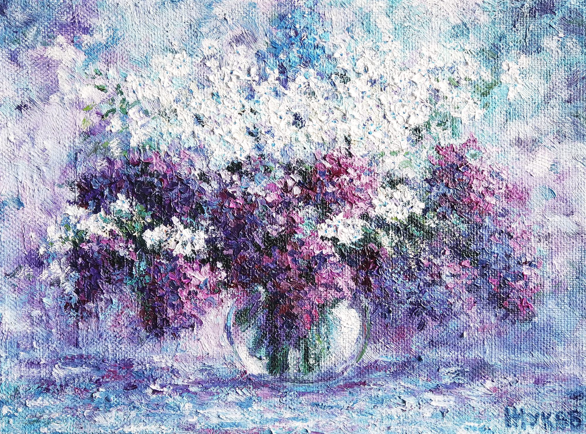 This work is light and bright, it seems to be filled with spring air. In a glass round vase there is a lush bouquet of lilacs: densely purple, lilac and white inflorescences. The flowers are painted with short, relief strokes - it seems that the bouquet is about to breathe and smell. The background is gentle, cold purple and blue tones, reminiscent of a mosaic pattern. The whole work creates a feeling of freshness, purity and subtle poetry of nature.