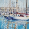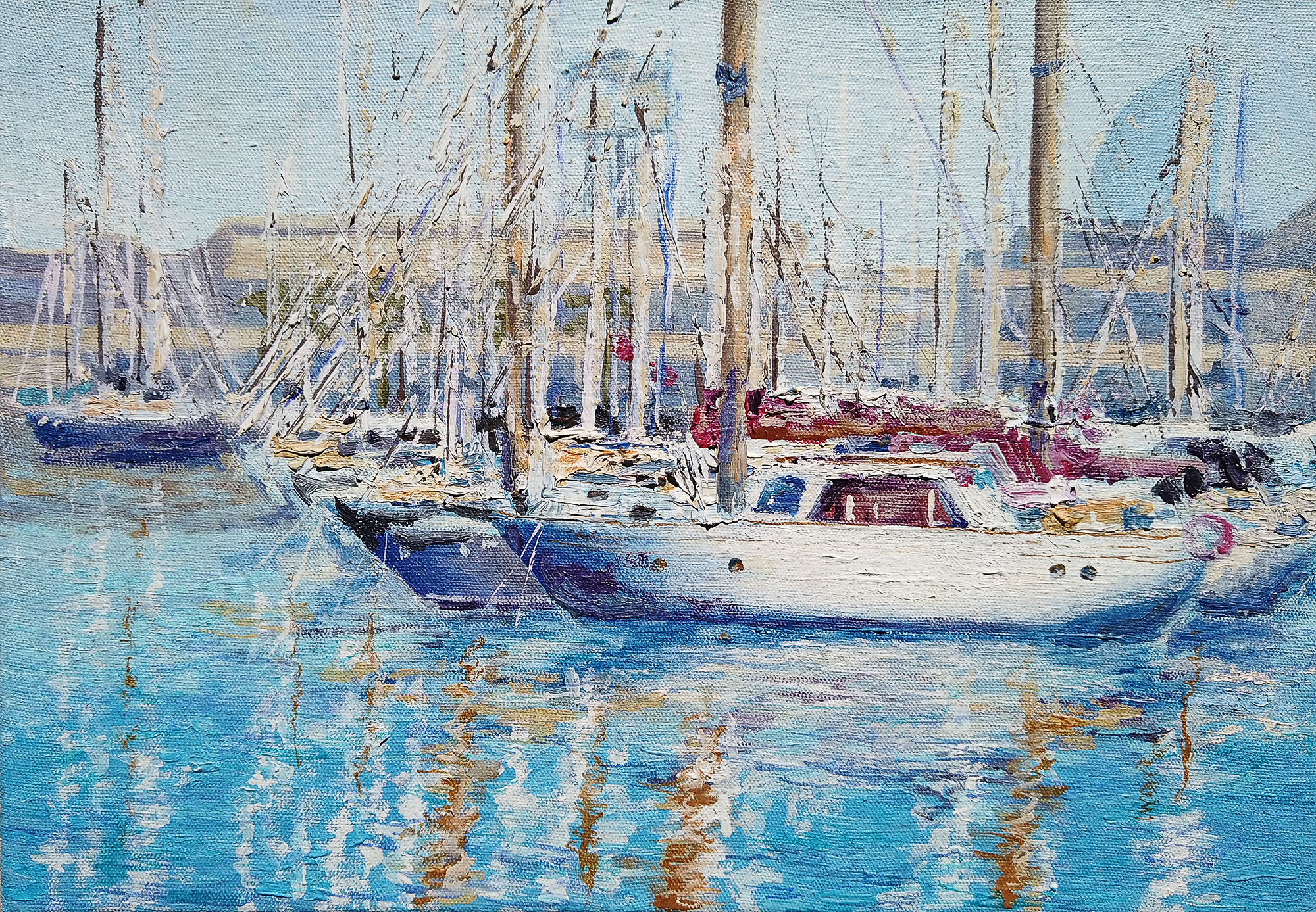 The painting depicts a picturesque seaport filled with snow-white yachts bobbing on clear blue water. The central place is occupied by an elegant yacht with red sailing equipment, next to it there is a row of other boats and yachts. The masts rush upward, creating a dynamic rhythm of verticals and their picturesque reflections on the water surface. The water is painted with light, free brushstrokes in bright blue, turquoise and golden shades, which creates a play of light and a feeling of summer warmth. In the background you can see the pier and the silhouettes of buildings, but all the attention is focused on the boats and their refined maritime atmosphere. The painting conveys a mood of relaxation, lightness and serenity by the sea.