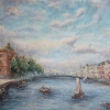 Before us is a calm city canal, bordered by ancient architecture. Small boats float on the water, their sails catching a light breeze. On the left is a row of green trees, behind which an ancient building with a dome can be seen, on the right is an extended line of houses. The color scheme is soft blue, beige and gray tones, creating a soft atmospheric mood of a warm day or early morning. The picture is full of light, air and peace.