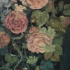 This is an exquisite composition of dense, luxurious roses and a variety of greenery against a dark background. Large flowers in soft pink-peach shades, with small yellow and white inflorescences breaking through. The petals and leaves are painted with attention to texture, the contrast of light and shadow, which creates a sense of depth and mystery. The work breathes romance and fills the space with the sophistication of an old bouquet still life.