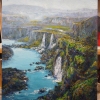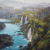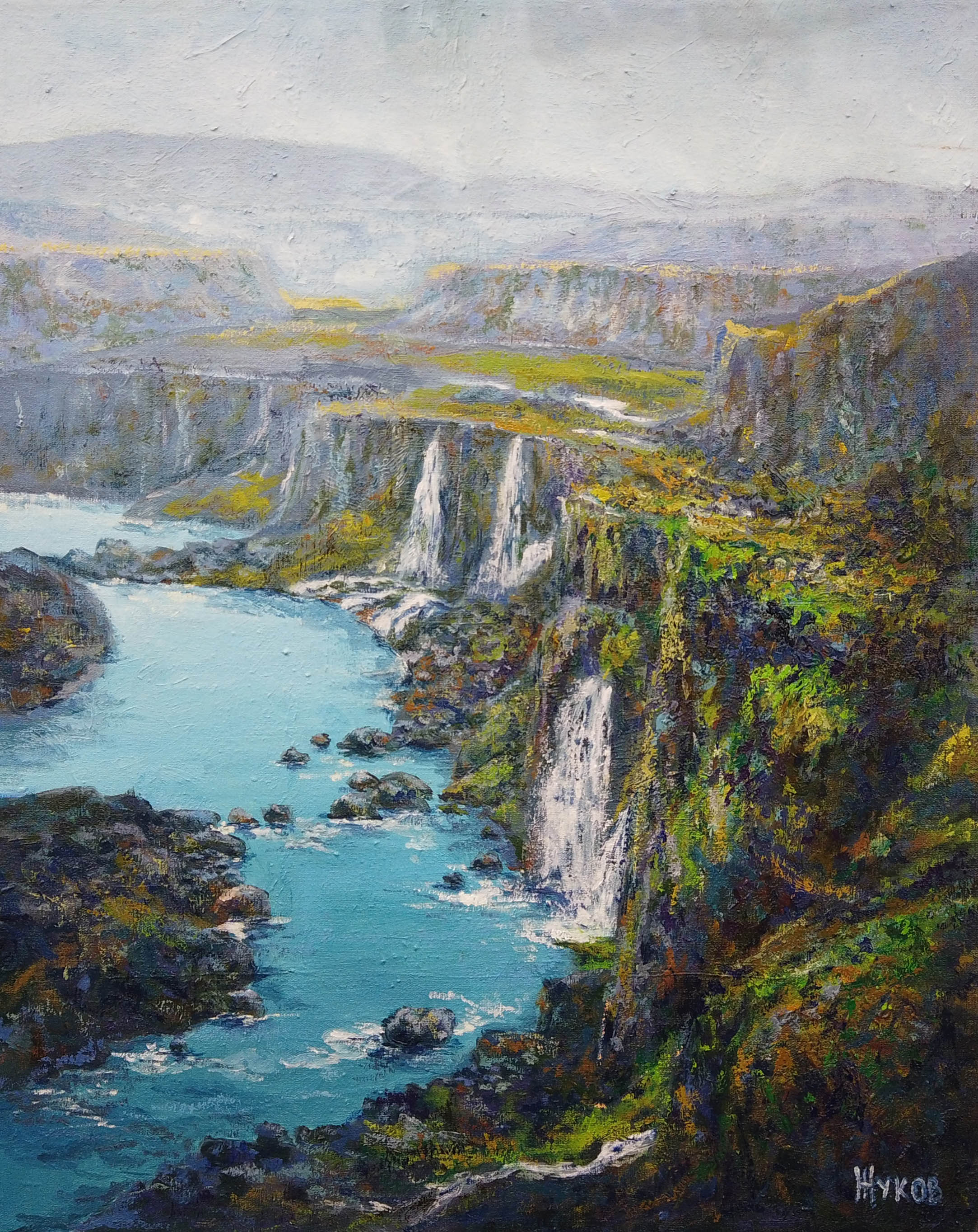 The landscape depicts a mighty body of water cutting into a rocky plateau with numerous waterfalls cascading down sheer cliffs. The stream of water is transparent, turquoise, strewn with dark boulders. Powerful rocks covered with moss and greenery contrast with the spacious, bright sky and blue-gray mountain distances. The grandeur of nature, you can feel the power and dynamics, the splashes of the waterfall seem to be heard beyond the canvas. The painting breathes space, freedom and at the same time something pristine, untouched by man.