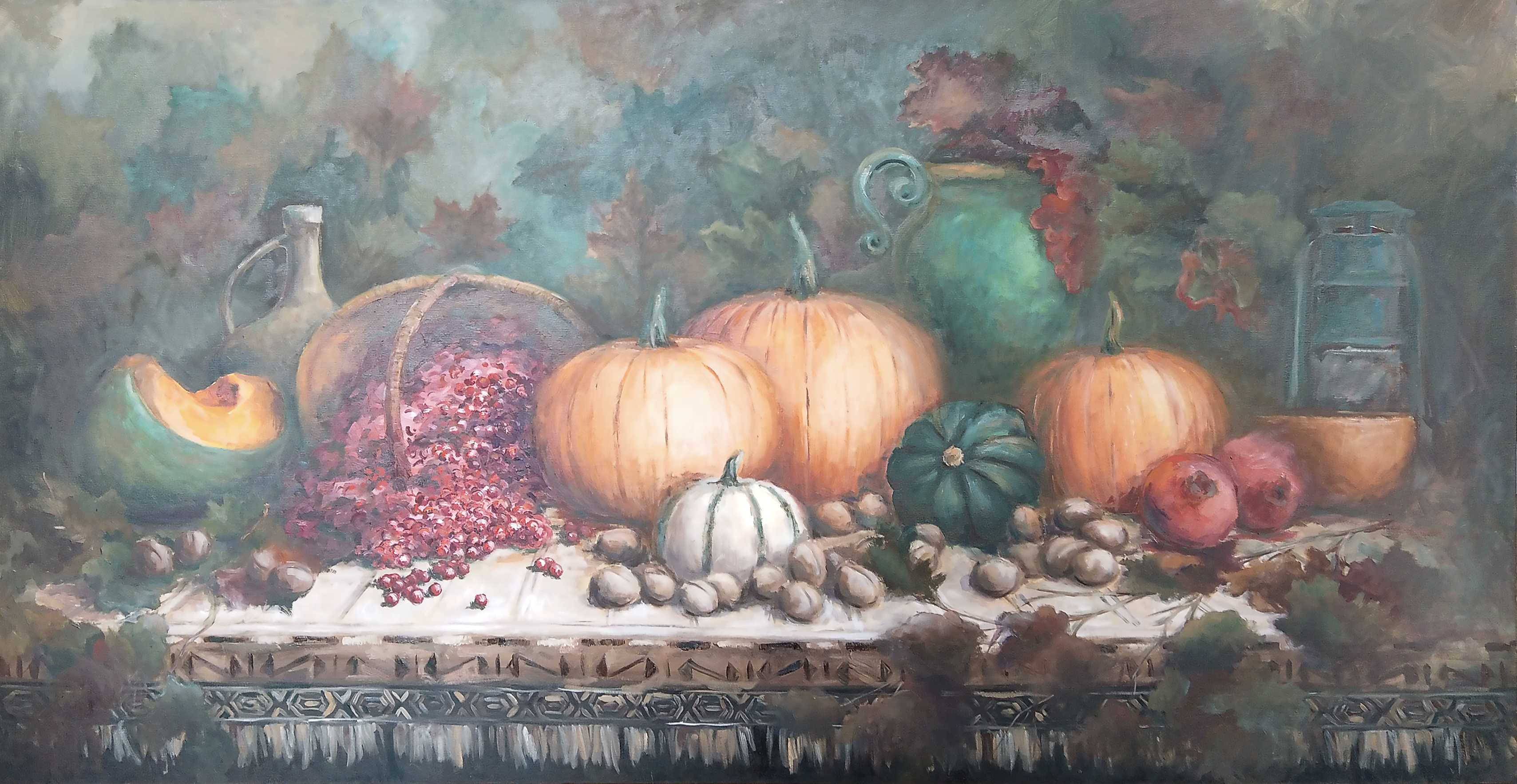 Before the viewer is a rich still life in a muted color scheme. On the table are laid out a variety of pumpkins (from yellow to dark green), kernels and nuts, pomegranates, clay jugs, an old bottle and a lantern. Pomegranate seeds generously spill out of a wicker basket, diluting the composition with scarlet splashes. Foliage scattered across the background emphasizes the autumn mood. The work amazes with its attention to detail and creates a feeling of home comfort and abundance.