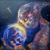 A mystical picture of space opens before the eyes: against the background of a dark night strewn with stars, a huge figure appears, woven from cosmic dust, light and energy. In this galactic haze, large eyes, a soft outline of a head and huge hands are discernible, carefully holding a shining sphere similar to the Earth. Light flashes of golden and purple glow intertwine between the creature and the planet, creating a sense of magical connection and protection. The planet is bathed in a halo of multi-colored sparks, and around it there is a sense of miracle, care and harmony between the Universe and life on Earth. The picture evokes thoughts about the fragility of the world and the mysterious mind that may protect it.