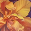 The picture shows a deep macro view of a flower in rich orange shades. The petals are wider and dynamically curved, playing with halftones from light yellow to warm scarlet. In the middle, there is a thick texture of stamens and mesmerizing drops of water that sparkle brightly in the sunlight, enhancing the feeling of freshness. Dark purple shadows create volume and a heartfelt depth. The picture is imbued with the power of natural splendor and the quiet joy of a new day.