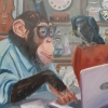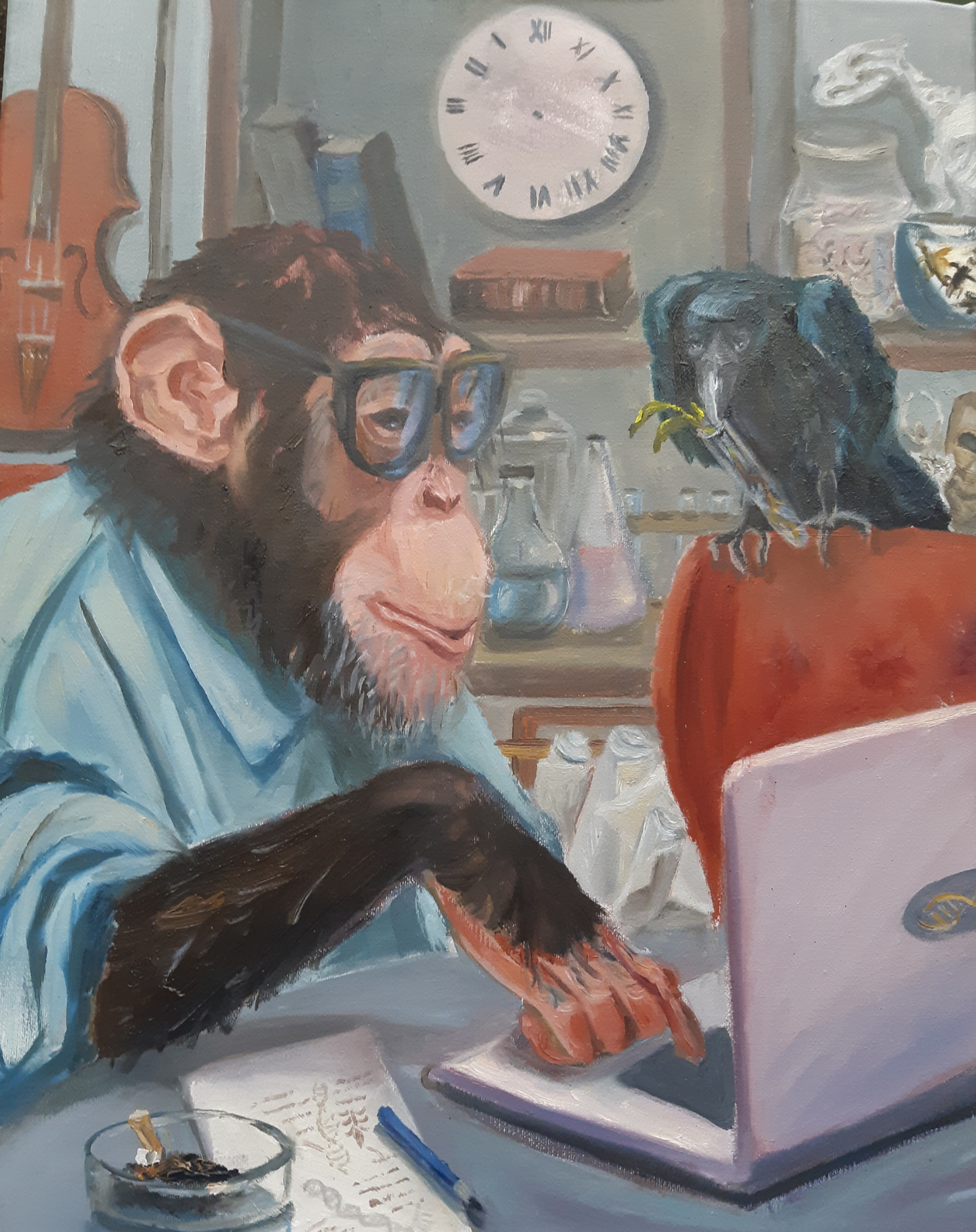 A monkey dressed as a scientist (wearing glasses and a blue shirt) is depicted in a funny, grotesque manner, working on a laptop in an office. A black crow sits next to her, holding something in its beak. In the background are laboratory details: books, flasks, watches, musical instruments. The painting is filled with humor, allusions to scientific activity and ideas of evolution. It emphasizes that curiosity and the desire for knowledge are inherent in the entire animal world and can be an ironic reminder of our own origins for the viewer.