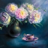 Картина «Розовые пионы» художницы Татьяны Устьянцевой — это изысканный и романтичный натюрморт, выполненный в глубокой, почти мистической цветовой гамме. Работа наполнена атмосферой уюта, тишины и утончённой женственности.