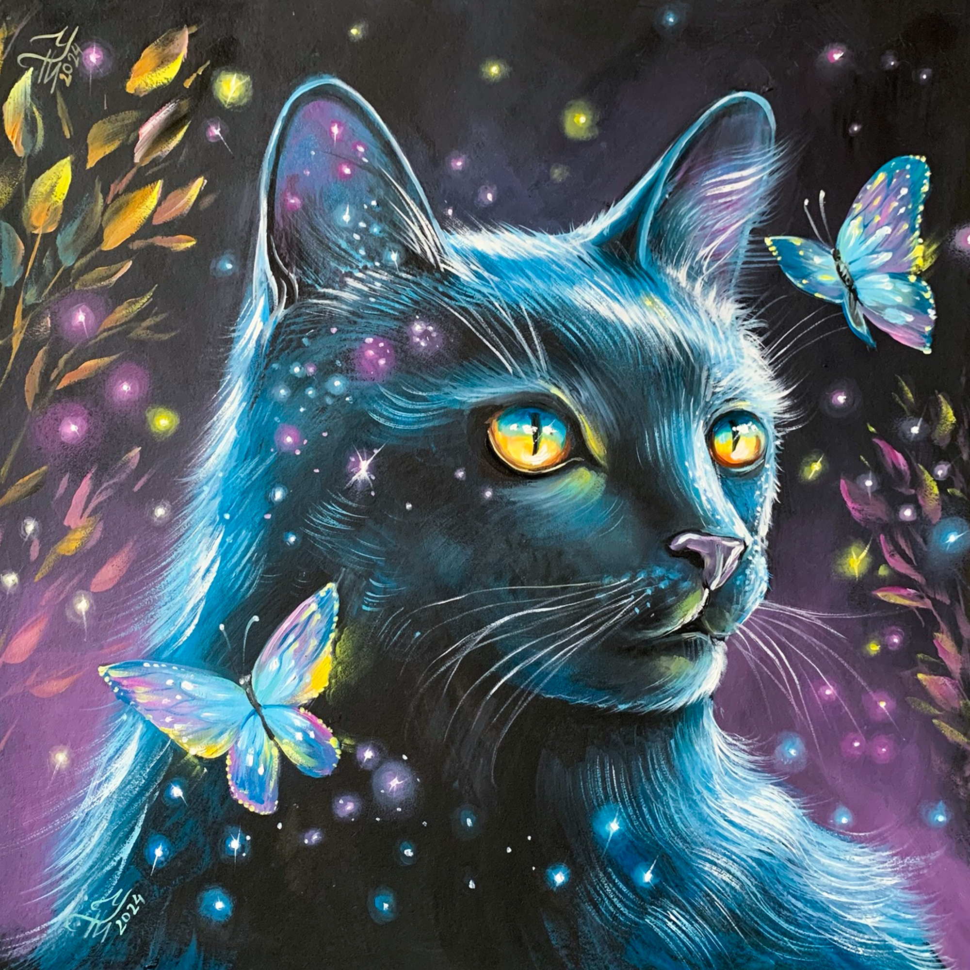 Greetings, art lovers. In my paintings, I like to depict wonderful emotions, feelings and impressions. Life itself is the most beautiful fairy tale - this is exactly the idea I want to convey with my work. In this painting, I wanted to convey the grace and beauty of a cat. After all, many people love these graceful animals. The picture can please all lovers of these cute animals.