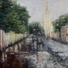 A quiet street is adorned with old buildings and a cozy park, seemingly hiding from the rain, inviting you to take shelter and enjoy this magical moment.