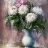 Colorful flowers come to life on the canvas, creating a bright and captivating atmosphere. The chrysanthemum petals shimmer as if dancing under the touch of light. The surrounding background, created with broad brushstrokes, adds an abstract harmony.