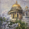 Небо над собором выполнено в мягких, приглушённых светло-серых и голубоватых тонах, характерных для весеннего дня в Петербурге. На этом фоне золотой купол сияет ещё ярче, а нежная сирень выделяется своим цветом.