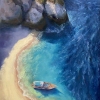 At the very center of the bay, near the beach, a small boat is moored, painted in light but detailed tones. It looks secluded, enhancing the feeling of a hidden paradise.