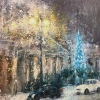 A special emphasis in the painting is placed on lighting. The street lamps emit a warm yellowish light that reflects on the wet or snowy surface, creating mysterious highlights and halos. The main festive element is a brightly decorated New Year’s tree standing to the right of the cathedral, radiating a blue glow that gives the scene a special fairy-tale atmosphere.