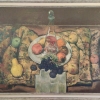 This is a classic still life, executed in warm, soft tones. In the center of the composition is a large dish with various fruits - apples, pears, oranges, grapes. The dish is on a spread fabric with a picturesque pattern, giving the scene coziness and depth. Particular attention is drawn to the tall glass decanter with a drink, which rises above the fruits, reflecting the light and surrounding objects. Several more fruits are located along the edges of the composition. The finishing and texture of the materials are carefully worked out, which gives the still life a special realism and harmony. The picture conveys an atmosphere of calm, home comfort and abundance.