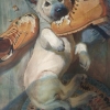 The watercolor depicts a mischievous light-colored puppy lying on the floor next to two worn-out yellow boots. One of the boots is clenched in its teeth and is already pretty much chewed up - pieces of leather upper are scattered across the floor. The puppy looks at the viewer with large innocent eyes, as if justifying its mischief. The whole scene is filled with home comfort: wooden floorboards with natural cracks, a bright round rug under the animal. The painting is imbued with kindness and light humor, it vividly conveys the carelessness and charm of puppy pranks.