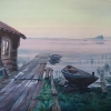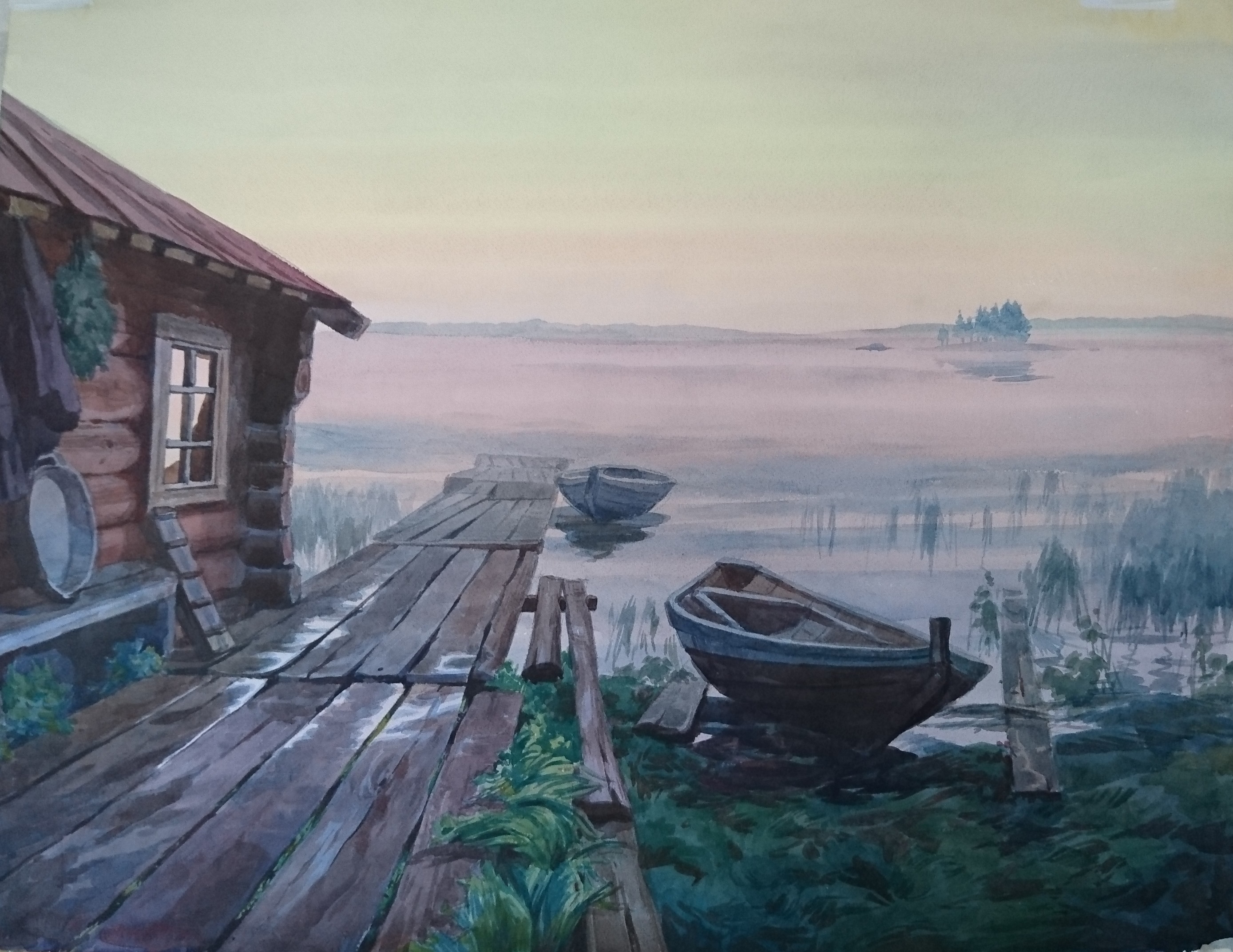 Here is a classic northern morning landscape: a wooden hut by the water, a long wooden pier stretching into the distance. Old boats are moored and lying along the shore. Everything is shrouded in a light haze, fog spreads over the water, letting through the golden rays of dawn. Islands on the lake are visible in the distance. The picture evokes tranquility, a sense of simplicity and solitude of village life, a kinship with nature.