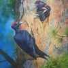 Before us is a touching scene from forest life. A large black woodpecker with a red cap clings tenaciously to the trunk of an old tree. In the hollow, three chicks eagerly stretch their beaks towards him, loudly asking for food. On the left are thick pine needles, and part of the background recedes into a mysterious blue shadow. The painting conveys the care and restless bustle of nature, supporting a sense of life and movement in the forest. The textures are masterfully drawn: both the bark of the tree and the plumage of the birds.