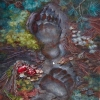 On the forest carpet of moss, twigs, leaves and fallen needles are depicted large prints of a bear's paws - dark, wet, just left on the ground. Among the forest litter, red fly agarics, pine cones and pieces of birch bark are visible. Nature is filled with life - it seems that the unconquered and powerful mistress of the forest has just left and is about to reappear behind the trees.