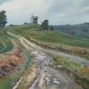 In the foreground is a winding country road, strewn with fresh puddles. The road goes into picturesque green hills covered with grass and bushes. On the hill on the right, an old wooden mill with wings, surrounded by trees, is visible. In the distance, houses and outbuildings are lost. The clouds reflect the fickleness of Russian weather. The painting gives a feeling of spaciousness, slight sadness, and memories of a leisurely rural life.