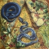 In a brightly lit clearing among forest grasses and strawberries, two vipers are visible: one is curled up in a ring, the other is stretched out like a blue zigzag ribbon. The palette is saturated with yellow-green, blue and brown shades, which emphasizes the natural habitat of the reptiles. Fresh leaves, strawberries, stones with lichens create a cozy, but slightly disturbing forest still life, in which the life of nature is harmonious and full of beauty - even where danger slumbers.