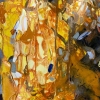 The painting is done in the impasto technique with thick, expressive brushstrokes of yellow, ochre, cream and brown colors. Fragments of lines and spots appear against the background of a warm golden glow, as if sunbeams break through dense foliage or the play of light on an amber surface. The abundance of bright accents and soft transitions creates a feeling of warmth and inner light, gives the composition liveliness and optimism. Contrasts between dense and translucent layers resemble moments of the passing sun or autumn foliage.