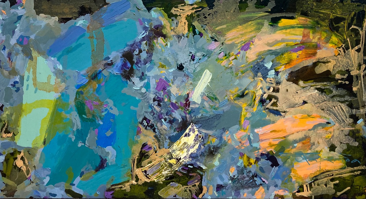 The energy of movement and chaos dominates the canvas - whirlwinds of blue, purple, green and yellow brushstrokes intertwine, creating stunning dynamism. The painting evokes associations with a stormy stream of water or a windy day, when light and shadow compete with each other, mixing colors and shapes. Light blue spots “refresh” the composition, and touches of red and lemon add drama and contrast. The work is filled with a sense of nature and mysterious freshness.