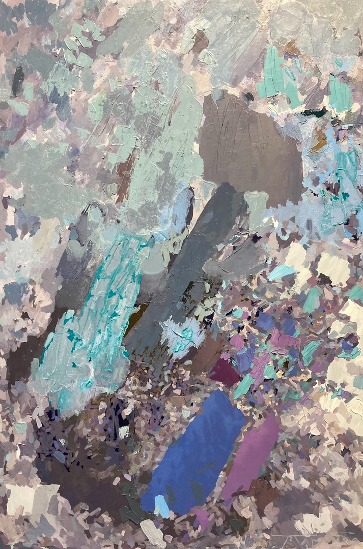 Here, gentle cold shades prevail - turquoise, light violet and gray-blue intertwine with soft brushstrokes of white, lavender, pastel green. In many overlapping brushstrokes, an impression of fresh air, dew, foggy morning or snow scattering is created. The dynamics of the large texture is combined with a subtle shift in tones: the painting seems to breathe frosty air and peace, conveying to the viewer a sense of space and light.