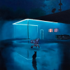 The dark night scene captures the plot in a vacant lot near the hypermarket, the entire space is illuminated by a bright blue, almost phosphorescent light. Neon lights are reflected on the wet asphalt. In the center, a black cat sits in front of an abandoned shopping cart, which seems to be lost outside of time and space. In the distance, the windows of the building dimly glow, and along the roof stretches a structure with antennas and a beacon. The picture is filled with an atmosphere of mystery, nocturnal homelessness, loneliness, but also inner strength.