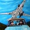 The foreground is occupied by a vintage blue passenger car, with two boys sitting behind the wheel and in the passenger seat, both with surprised and worried expressions. A white owl in a cage is also visible in the car. A fighter jet with red stars on its wings flies low right above the car. The painting combines allusions to the Soviet past, childhood culture and elements of adventure fantasy, creating a dynamic and slightly absurd scene.