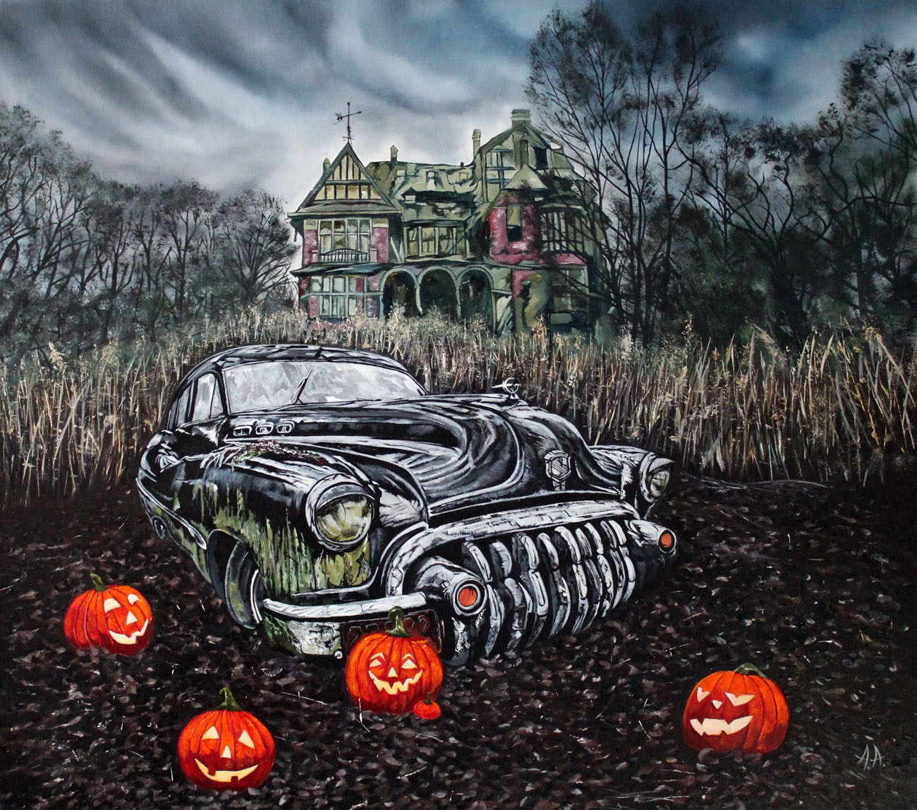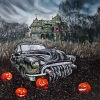 In the foreground is an old American car with a frightening radiator grille, covered in moss and rust, as if it came out of a horror movie. On the gloomy ground around, glowing pumpkins with cut-out creepy smiles are placed. In the distance, an old unusual mansion rises, evoking thoughts of ghosts. The atmosphere of the painting is gloomy and mysterious, with a strong reference to the theme of Halloween and Gothic stories.