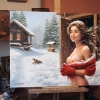 The painting depicts a young girl with long, flowing hair standing on the threshold of a wooden bathhouse on a frosty winter day. Her face is illuminated by a joyful smile, and her body is covered with a light layer of snowflakes. The girl is wrapped in a warm red woolen scarf and mittens, but her shoulders and chest remain open, as if she is enjoying the contrast of the icy air after a hot steam room.
