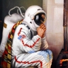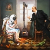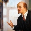 This painting is a surreal scene in which two characters from different eras and worlds meet. In a small, old-fashioned office, an astronaut in a spacesuit and Vladimir Lenin are sitting in front of a hot stove. The astronaut, wrapped in a scarf and barefoot, looks tired and thoughtful, as if he had ended up there by accident and cannot comprehend what is happening. Lenin, leaning on the back of a chair, gesticulates energetically, as if giving a lecture or expounding important ideas.