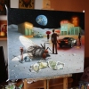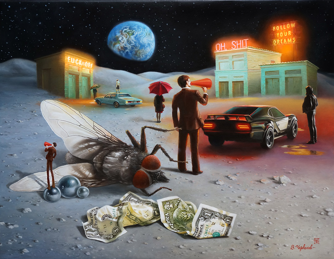 ”A Dream on a Moonlit Night (almost Shakespearean) or Two Crumpled Dollars” is another piece from the lunar theme. The color palette of the painting is not gloomy; on the contrary, there is plenty of light, people—in general, life on the Moon is present, but you immediately sense that something is off.