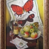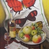 At the center is a porcelain dish with apples and grapes, gifts from a generous garden. Nearby stand a bottle of cognac and a glass, hinting at a leisurely evening conversation. But the main highlight of the still life is a light towel adorned with bright butterflies, serving as the background for the composition. It connects the earthly fruits with the ephemeral beauty of living nature, creating a harmonious balance. The envelopes on the table add a touch of reality, emphasizing the atmosphere of everyday life.