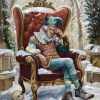 В центре внимания — пожилой мужчина, восседающий на роскошном кресле, обитом красным бархатом, которое явно претендует на роль трона. Он одет в костюм шута или менестреля: яркий камзол, пышный белый воротник-раф и колпак шута с бубенчиками. Его поза расслаблена, но на лице читается глубокая задумчивость или даже меланхолия. Одна рука прижата к голове, что усиливает ощущение усталости от власти или игры.
