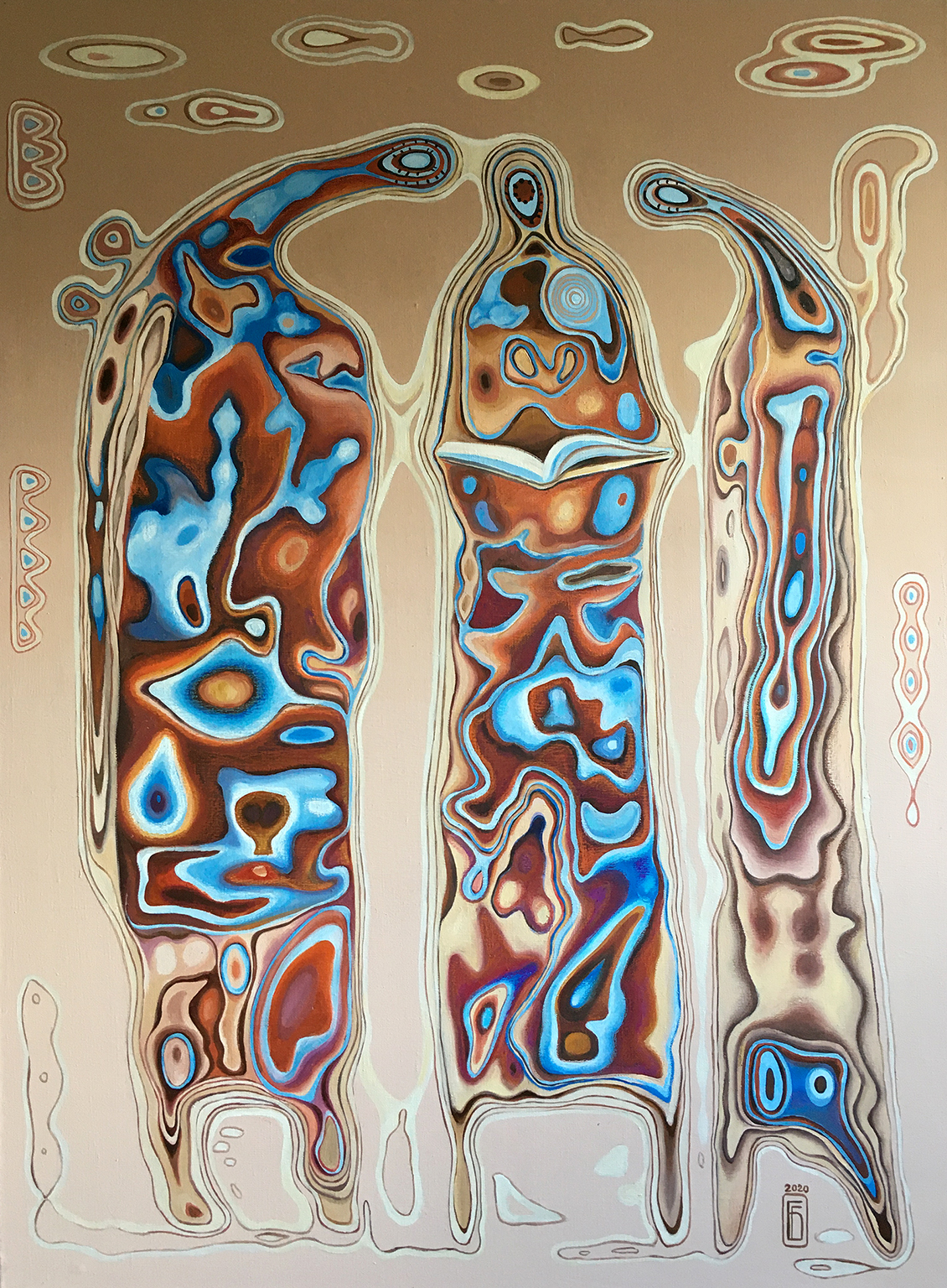 The wave direction is characterized by complex rhythmic organization, color pulsation, which visually creates the effect of the movement of time, rhythm, color, and the plastic alternation of various forms of lines. It is a search for the newest forms of expressing the wave structure of the world, the interpenetration of spaces and universal interaction, multidimensionality, and the boundlessness of endless flows of types of energies, emotionality, and expression in a painting.