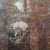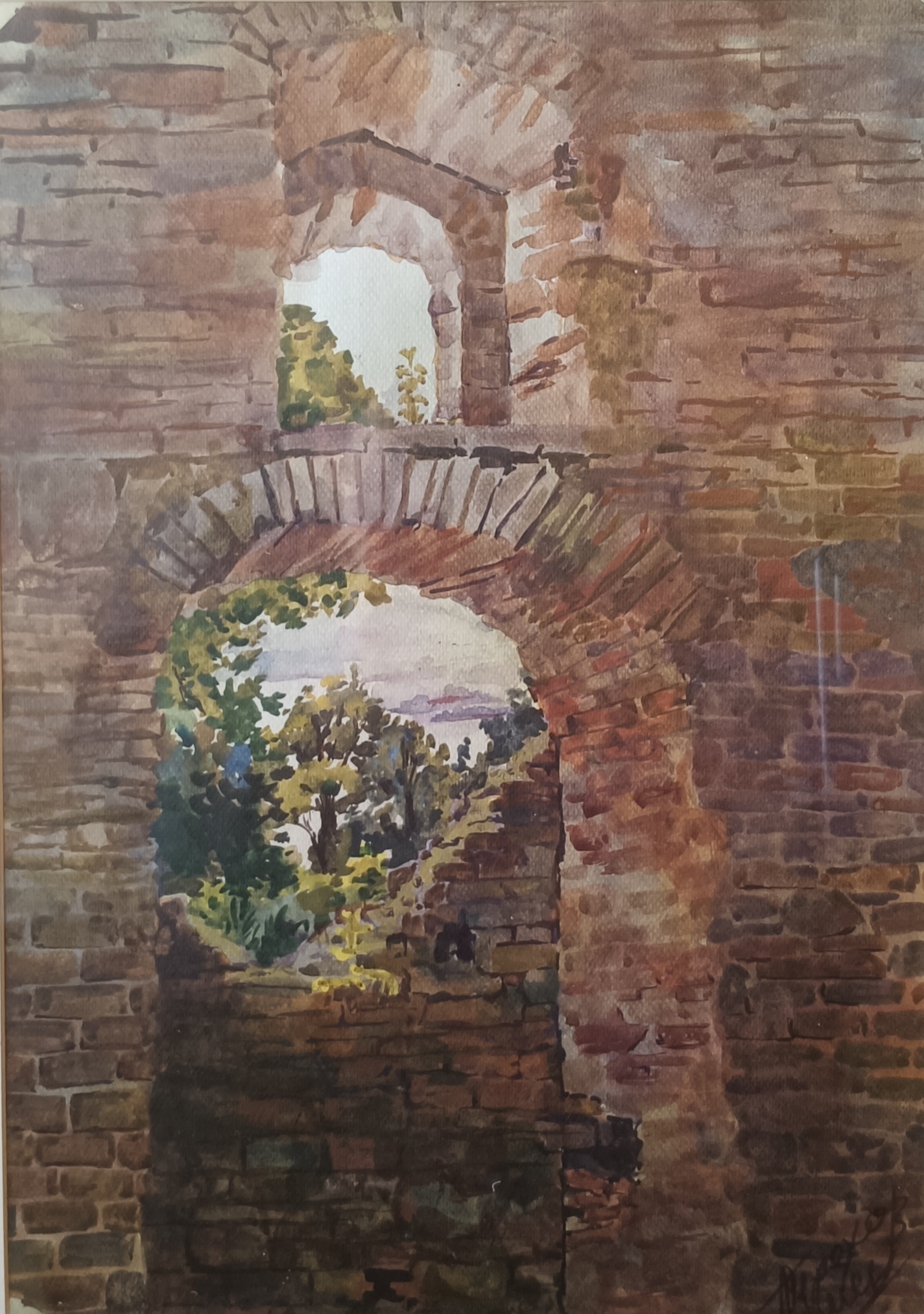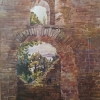 In the center of this watercolor is a fragment of an ancient wall, made of large, multi-colored stone, overgrown with moss and time. Two dilapidated arched openings open up to a view of the green crowns of trees and the distant blue of the sky. Those who look at the painting seem to peer into ancient times through these arches, feeling the breath of history and the mystery of the fortress walls. The warm, ochre-brown tones of the masonry contrast with the bright green and light sky, creating the effect of a frame through which life beyond the ruins is visible. Everything breathes the peace of desolation and the mystery of eternity.