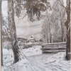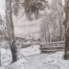 A graphic work filled with a feeling of Russian winter. The focus is on a country road with footprints, passing between the trunks of pine trees, leading to a wooden fence and further to the houses in the background. Everything is covered in snow, heavy tree branches frame the scene and bend slightly under the snow. The drawing conveys the atmosphere of solitude, silence and tranquility of a winter village, where life seems to freeze and wait for spring.
