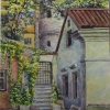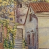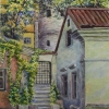 A cozy courtyard is depicted in watercolor. In the foreground, the stairs leading to the lattice door are entwined with ivy. Two houses with different roofs and old plaster create a feeling of peace and antiquity. A little further, behind the crowns of trees, a round tower with small windows rises. Penumbra reigns everywhere, running across the paved courtyard, and the variegated foliage of the trees creates a feeling of serenity, comfort and touching urban history.