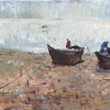 The painting conveys the breath of simple, harsh life by the sea. On the coastal sand are two old boats, around which vague figures of fishermen are bustling, painted with energetic brushstrokes. The color palette is muted, with earthy and gray-blue tones dominating, giving the scene the atmosphere of early morning or a cloudy day. In the distance, the calm surface of the water glows, where the whitish sky merges with the horizon. The work evokes the romance of everyday work and unity with nature.