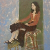 The painting depicts a girl with long dark hair sitting on a high chair, wearing a brown skirt and a bright, colorful red blouse. Her pose is calm, her hands are casually lying on her knee, slightly turned in profile. The background is conditionally divided into two spaces: a green part behind the model and a bluish-gray one on the sides, which helps to highlight it in the composition. The face is slightly blurred, which gives the image mystery and some detachment. The painting is painted with broad, picturesque brushstrokes, it feels like an atmosphere of silence and thoughtfulness.