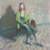 The canvas depicts a young woman sitting sideways to the viewer in a heavy wooden chair. She is wearing a green suit, her hair is reddish. The figure is illuminated by diffused soft light, and there is a dark shadow behind her. The wall and floor are covered with decorative painterly brushstrokes of soft pink, peach and green shades, which creates a barely noticeable texture. The image is slightly detached, thoughtful and intimate melancholy.