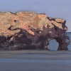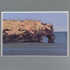 The canvas depicts a coastal landscape: a massive rocky cliff with a natural arch hangs over the calm blue of the sea. Textured, impasto brushstrokes on the upper part of the cliff imitate the roughness of the stone, contrasting with the smooth, almost mirror-like water. The painting conveys the power and monumentality of nature, and the laconic color palette emphasizes its harsh beauty.
