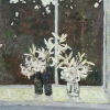 The foreground of the painting is occupied by a wide windowsill, on which there are three transparent vases filled with white lilies. Behind the glass is a dark, as if pensive garden, on the glass are reflections and random spots, like traces of rain or light. The overall color scheme is cool, with soft yellow and green notes. This composition is about the silence of home, about contemplating beauty through a window into the world beyond everyday life.