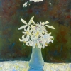 В центре композиции — букет белых лилий в синей вазе, стоящей на столе, покрытом светлой скатертью. Благодаря тёмному, тёплому зелёно-оливковому фону, цветы кажутся особенно светящимися, чистыми, подчёркнутыми жёлтыми тычинками. Над букетом ощущается лёгкость пыльцы или отражений, придающих картине воздушность и праздничность. Цветочные мазки выполнены пластично, рельефно, каждая лепесток обладает текстурой и светом.