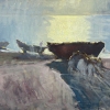 Massive fishing boats are located along the slope of the sandy shore. Behind them stretches the mirror-like surface of the sea with a golden reflection of the setting sun. The light spills out as a bright yellow spot, gradually refracting in the turquoise and lilac shades of the sky. The soft pastosity of the brushstrokes creates the illusion of instability, a transitional boundary between reality and dream.