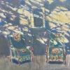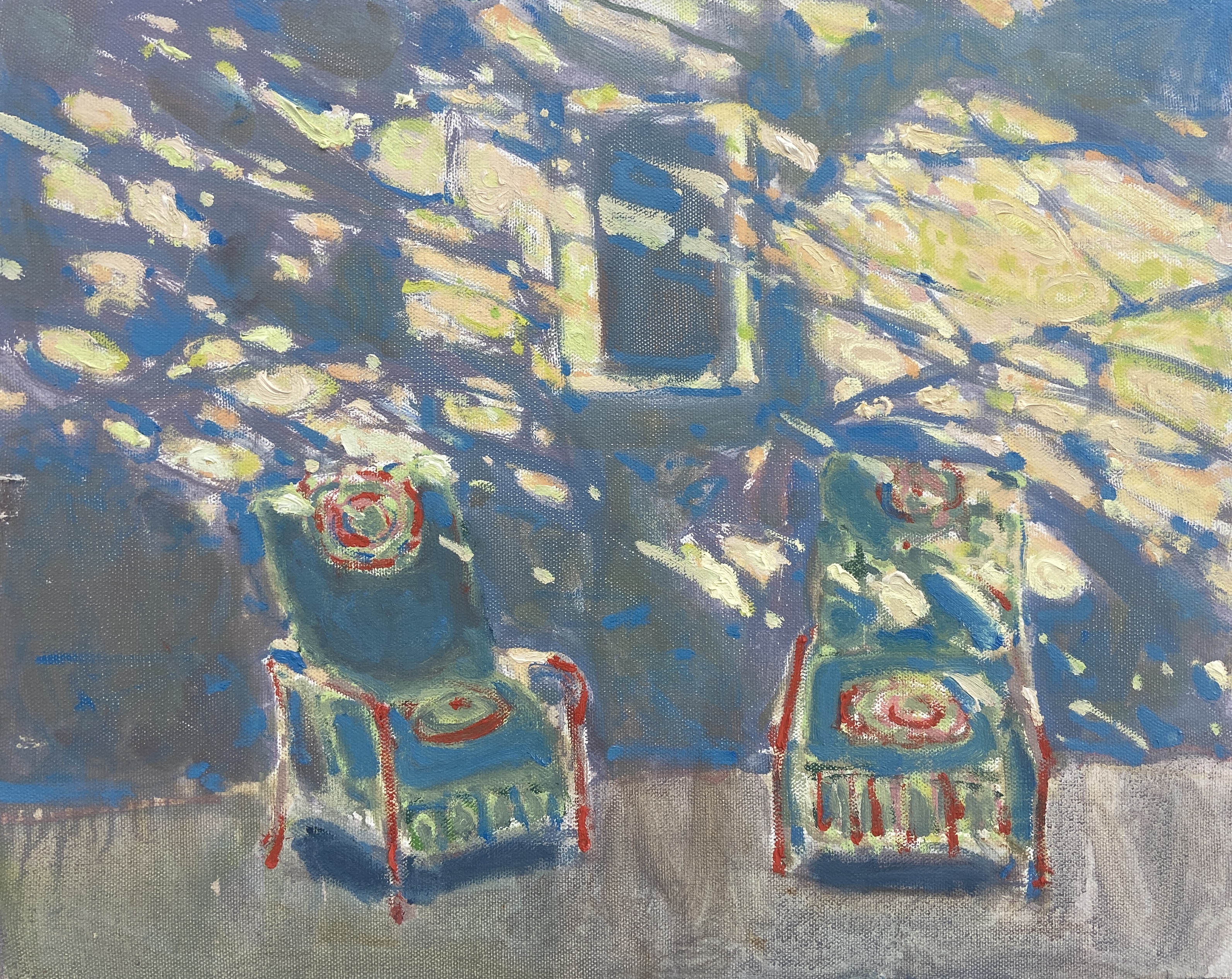 Two wicker chairs on a terrace or veranda, illuminated by spots of sunlight running across the floor and wall. The interior is shown symbolically: the emphasis is on light spots, blue and yellow shades with red contours of the chairs. The painting is filled with a play of light, a feeling of coziness and a serene summer holiday.